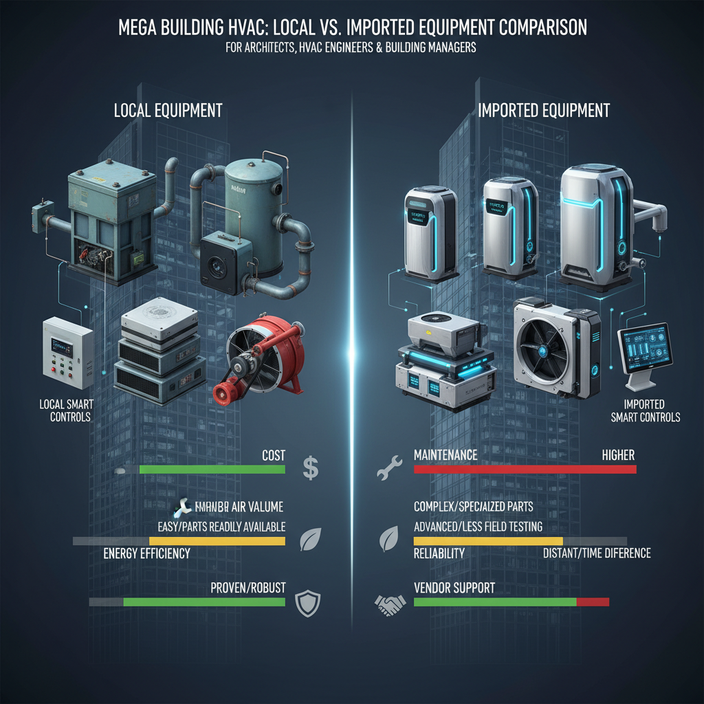 Comparison diagram showing local vs imported HVAC equipment performance, cost, maintenance, and energy efficiency for mega building projects.
