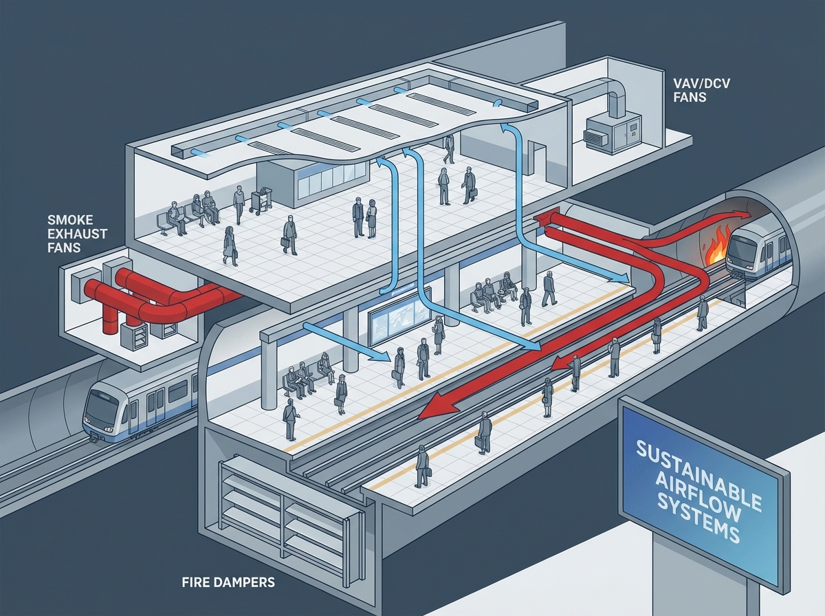 Metro and subway stations present unique ventilation challenges due to confined spaces, high passenger density, and continuous train operations. Effective systems must: