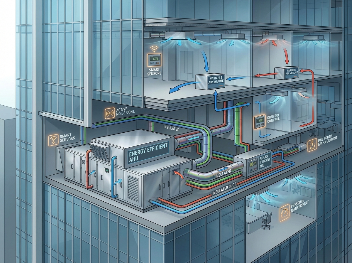 Upgrade AHUs, chillers, and fans; use VAV systems; optimize ductwork; integrate building automation.