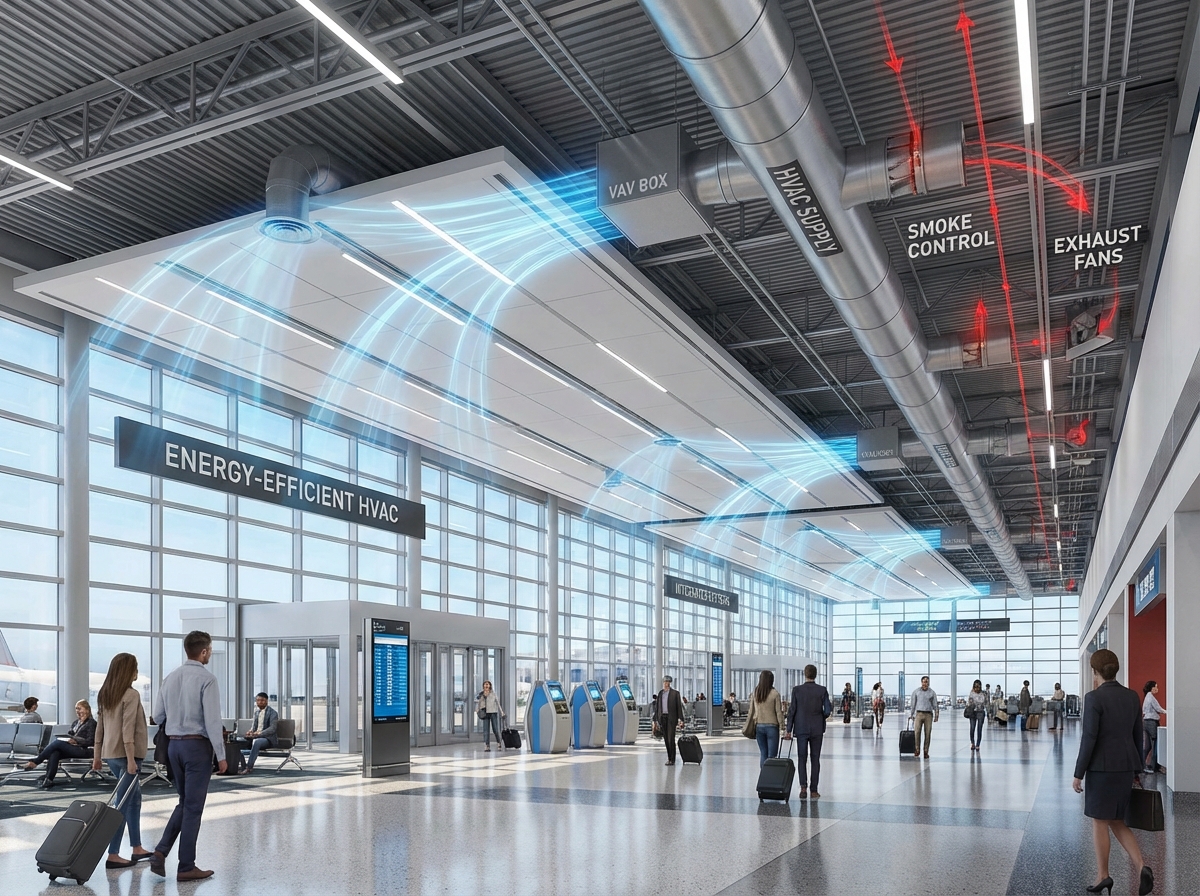 Airport terminals are among the most complex environments for HVAC systems. Large open spaces, high ceilings, and varying occupancy create unique airflow challenges. Efficient HVAC solutions must balance passenger comfort, energy efficiency, and safety compliance.