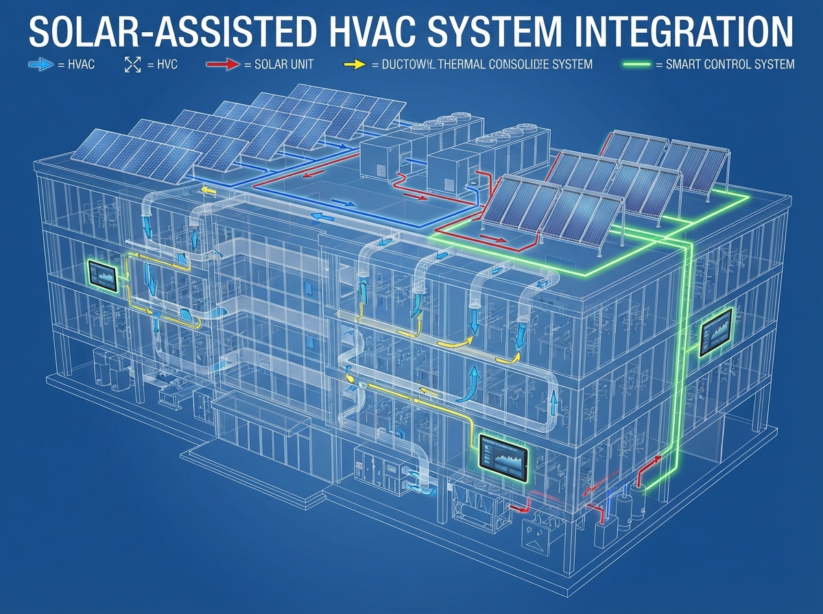 Solar-assisted HVAC systems combine photovoltaic (PV) panels, solar thermal collectors, and smart controls to optimize energy use.
